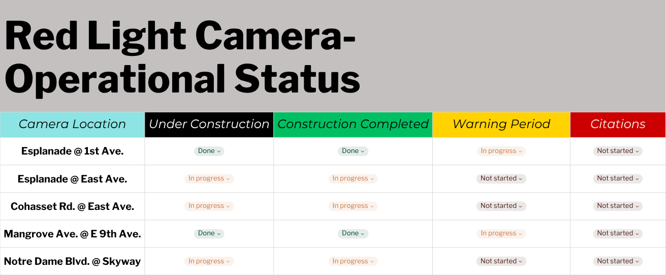 The cameras will go live as they are ready, each with its own 30-day warning period. After the warning period has ended, the cameras will begin issuing citations for all red-light violations. Any vehicle captured failing to stop at a red light or turning right without coming to a complete stop will be sent a citation of $465.